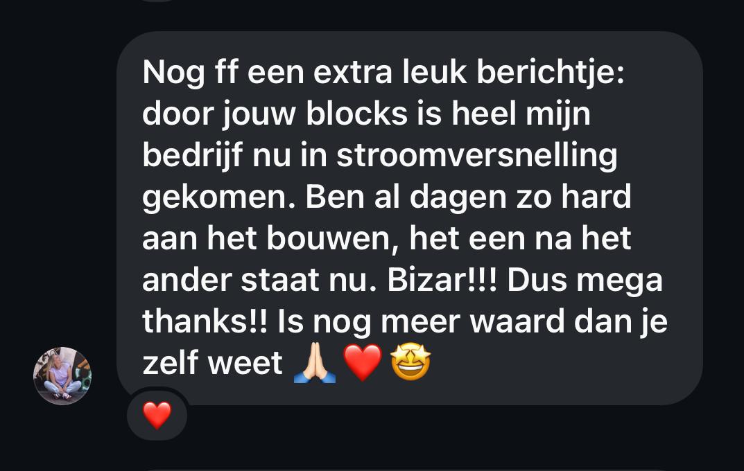 Ik host regelmatig een live Workshop in Utrecht waar je met mij en een aantal mede-ondernemers aan de slag kan met de BUILDING BLOCKS! Als er één gepland staat, staat ie als kassakoopje bij de checkout.