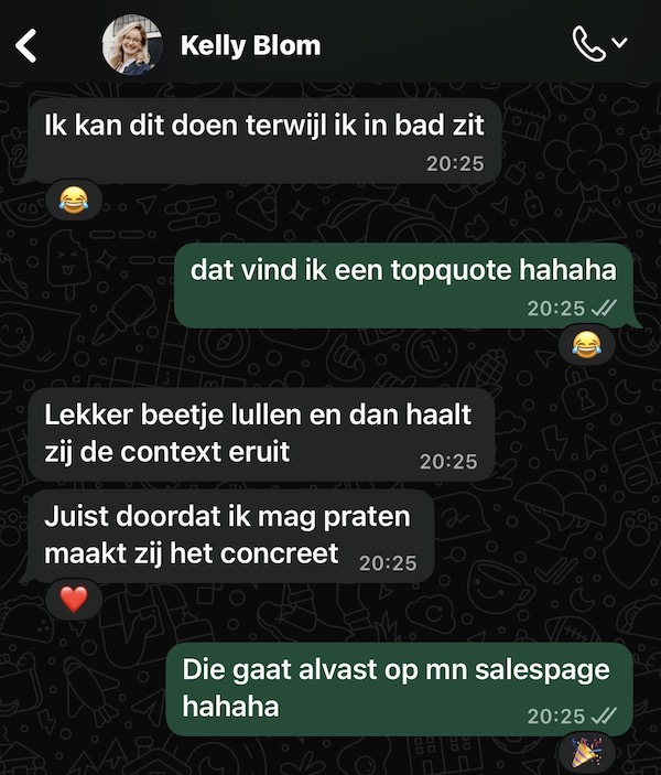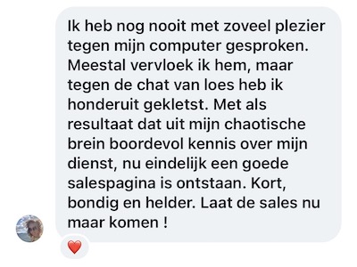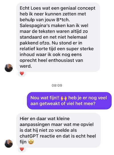 Let’s be honest: het blijft AI en de output blijft afhankelijk van hoe sterk ook jouw input is. Als ik jouw tekst schrijf met mijn Salespagina Tekst Upgrade, kijk ik naar álles wat jij online hebt staan en vind ik waarschijnlijk originelere invalshoeken than this B*TCH :p. Maar daar is natuurlijk ook het prijsverschil naar. Ik zou zeggen: start hiermee, en kijk hoe goed ze jouw boodschap al te pakken heeft! 🔥